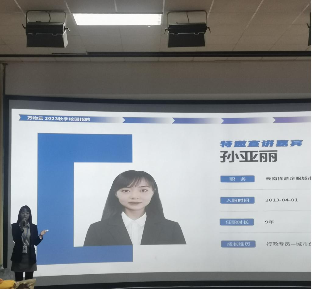 万科物业昆明城市中心负责人孙亚丽针对目前万科物业企业发展现状、人才培养机制、招聘计划、员工薪酬结构等作了详细的介绍。2022届旅游管理专业毕业生吴迪以万科物业员工的身份和学弟、学妹们分享了就业体验。