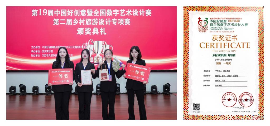 世界杯官方网站入口2026酒店管理专业吴学会、易依、马晓宇、张俊梅四位同学,在第19届中国好创意大赛乡村旅游设计专项大赛决赛中荣获一等奖。