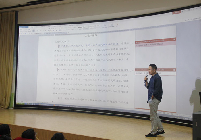 讲座从提出入党申请的条件、撰写入党申请书的格式及入党申请的注意事项等内容入手,以完整的入党申请书为例子,为新生讲解入党的态度、动机、目的、决心、对党的认识,自己的优缺点等各部分的撰写规范。在培训到达尾声的时刻,讲座的老师为2018级全体新生答疑解惑,并号召同学们积极申请加入中国共产党。