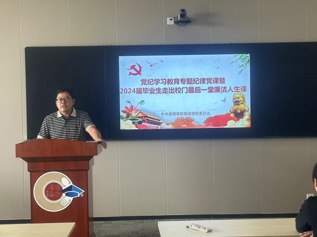 在2024届毕业生走出校门最后一堂课—廉洁人生课中,先守福对毕业生党员提出明确要求:一是要提高自我要求,注重自律自省。二是要注重理论武装,增强法纪意识。结合学习贯彻习近平总书记对旅游工作作出的重要指示精神和老员工肩负的历史使命,希望毕业生党员要涵养心中浩然正气,勇于担当历史重任,坚守干净人生底线,秉持传承昆院精神。