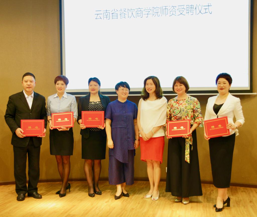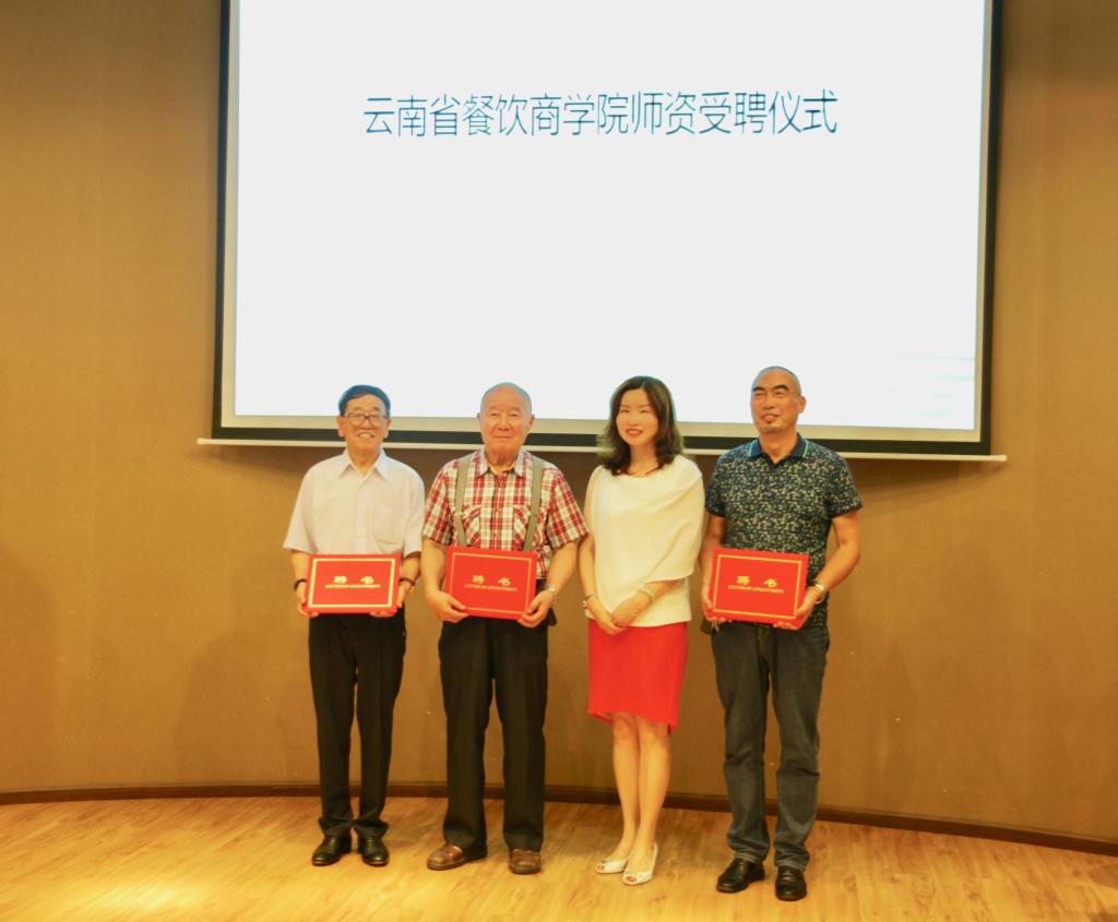 在参会人员的共同见证下,张宪荣会长和田芙蓉经理一同为聘请的专家和大师发放聘书,并在会后一同参观了云南省餐饮商公司教室。