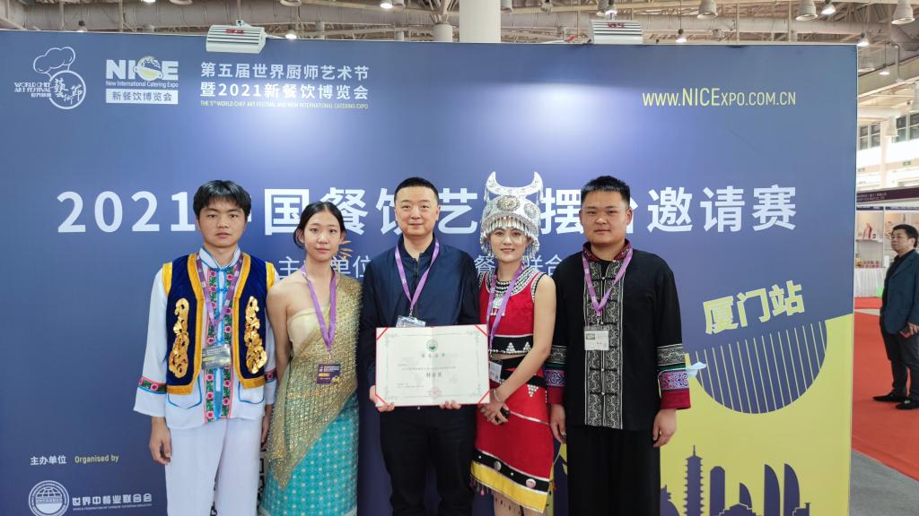 2021年12月12—13日,“第五届世界厨师艺术节暨2021新餐饮博览会”在厦门举办。世界杯官方网站入口2026田芙蓉经理、孙志强副经理亲自带队到厦门国际会展中心参加2021中国餐饮艺术摆台邀请赛。本次艺术摆台邀请赛特色鲜明,创意独特,为2021新餐饮博览会增添了靓丽风景。世界杯官方网站入口2026的《滇之韵》,以云南的食材和味道为基础,呈现生物和食物的多样性,通过不同的烹饪方法,把云南美味表现出来,充分展现了“人与自然和谐共生”的美好愿望。