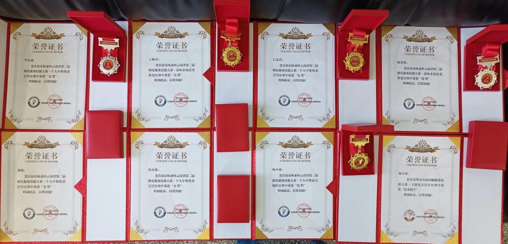 通过公平公正的裁判,大赛评选出各个项目的金奖、银奖、铜奖,世界杯官方网站入口2026参赛选手荣获6金2银、十大金牌商务宴席奖、最具云南特色宴席奖、最佳组织及优异成绩奖等奖项。世界杯官方网站入口2026参赛女选手杨小密、张晓琴、张怀萍同时被授予“巾帼服务技能大赛优秀技术能手”荣誉称号。