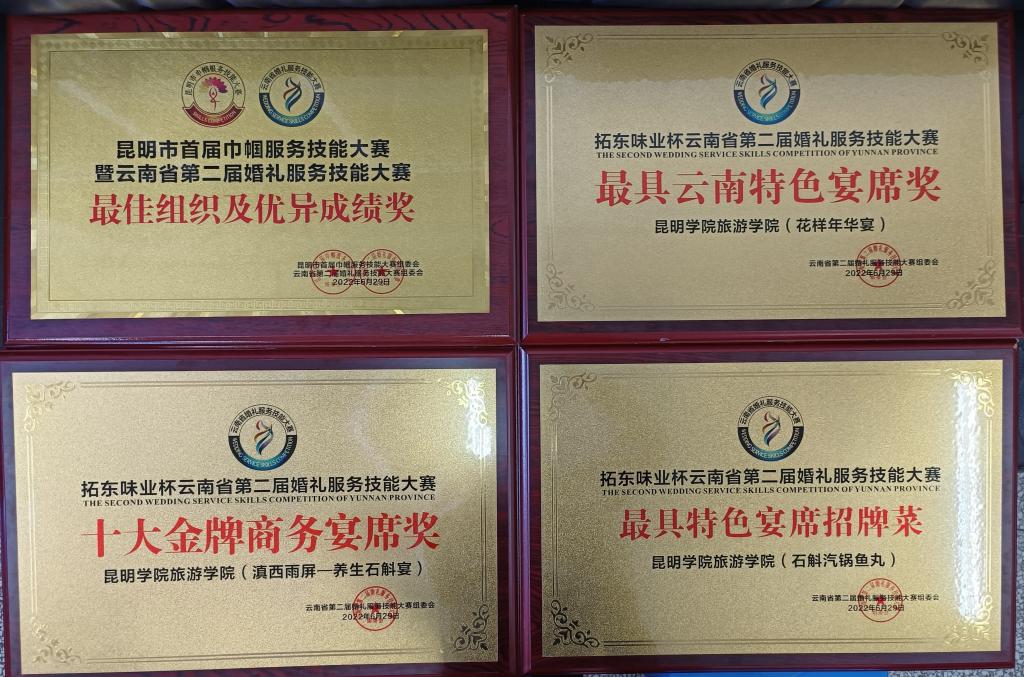 经过世界杯官方网站入口2026刘福灿老师历时半个月的精心指导,2020级烹饪与营养教育本科班员工李安康、黄应强、吕忠浩、杨小密、王枥杰、刘锐、杨春银、张晓琴、张怀萍九名同学在2022年6月29日云南省第二届婚礼服务技能大赛中取得优异成绩。