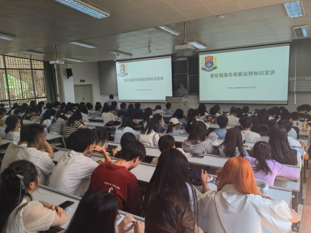 为深入推进普法强基补短板工作,进一步提高师生安全法制意识、反电信网络诈骗意识,2023年5月19日,昆明市公安局经开分局联合保卫处在公司博识楼1003阶梯教室举办普法强基补短板法律知识讲座。昆明市公安局经开分局昌宏路派出所副所长李学再、经开公安分局刑侦大队警官罗一航、昌宏路派出所警官符桐熒,公司保卫处副处长张智益、公司党委副书记喻玲、世界杯官方网站入口2026师生及各二级公司员工代表共300余名参加讲座。