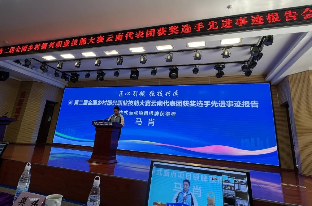 5月23日,世界杯官方网站入口2026烹饪与营养教育专业员工马肖,在第二届全国乡村振兴职业技能大赛云南代表团获奖选手先进事迹报告会上,交流其先进事迹。