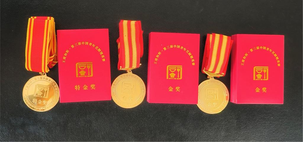 赛前公司刘福灿老师精心指导2021级烹饪与营养教育专升本1班刘贵明、李钰,2022级烹饪与营养教育专升本2班郝兴福等8位同学参加赛前集训,优中选优,由刘贵明、李钰、郝兴福三位同学代表公司参加此次厨艺大赛。经过不懈努力,刘贵明同学荣获员工组全场最高分92.2分特金奖晋级全国总决赛,李钰、郝兴福同时荣获金奖。