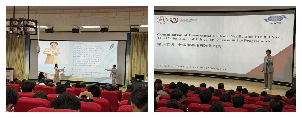 讲座伊始,谢慧孜副主任深入浅出介绍了《全球旅游伦理规范》的背景、意义、核心内容。她指出,随着全球旅游业的快速发展,旅游伦理问题愈发凸显,《全球旅游伦理规范》的制定,正是为了引导旅游从业者和游客树立正确的价值观,推动旅游业可持续发展。谢副主任通过丰富的案例,生动的讲解,让在场师生对旅游伦理重要性有了深刻的理解。随后,谢副主任分享了宁波大学热昂大学联合公司在践行《全球旅游伦理规范》过程中的实践经验。她提到,公司通过创新课程设置、开展实践活动、与旅游企业深度合作,将旅游伦理理念融入教学与实践各个环节。这些举措,不仅提升了员工的专业素养,也为旅游行业的可持续发展培养具有责任感的高素质人才。谢副主任的分享,为公司探索旅游伦理教育提供了宝贵参考。